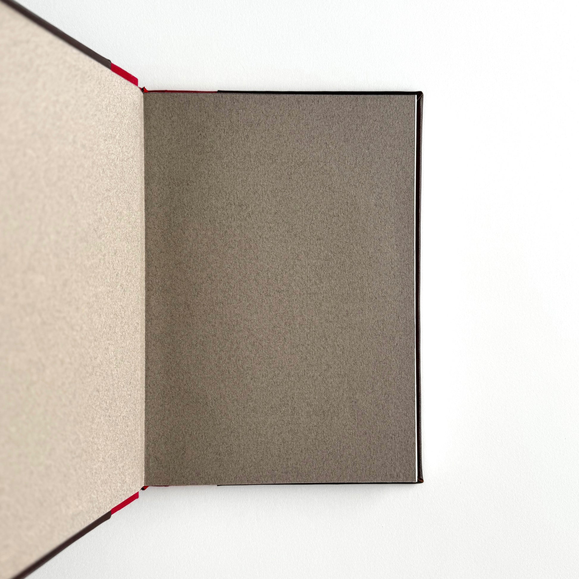 Koyu kahverengi, parlak, hakiki deri ve kırmızı, keten cilt bezi ile ciltlendi.