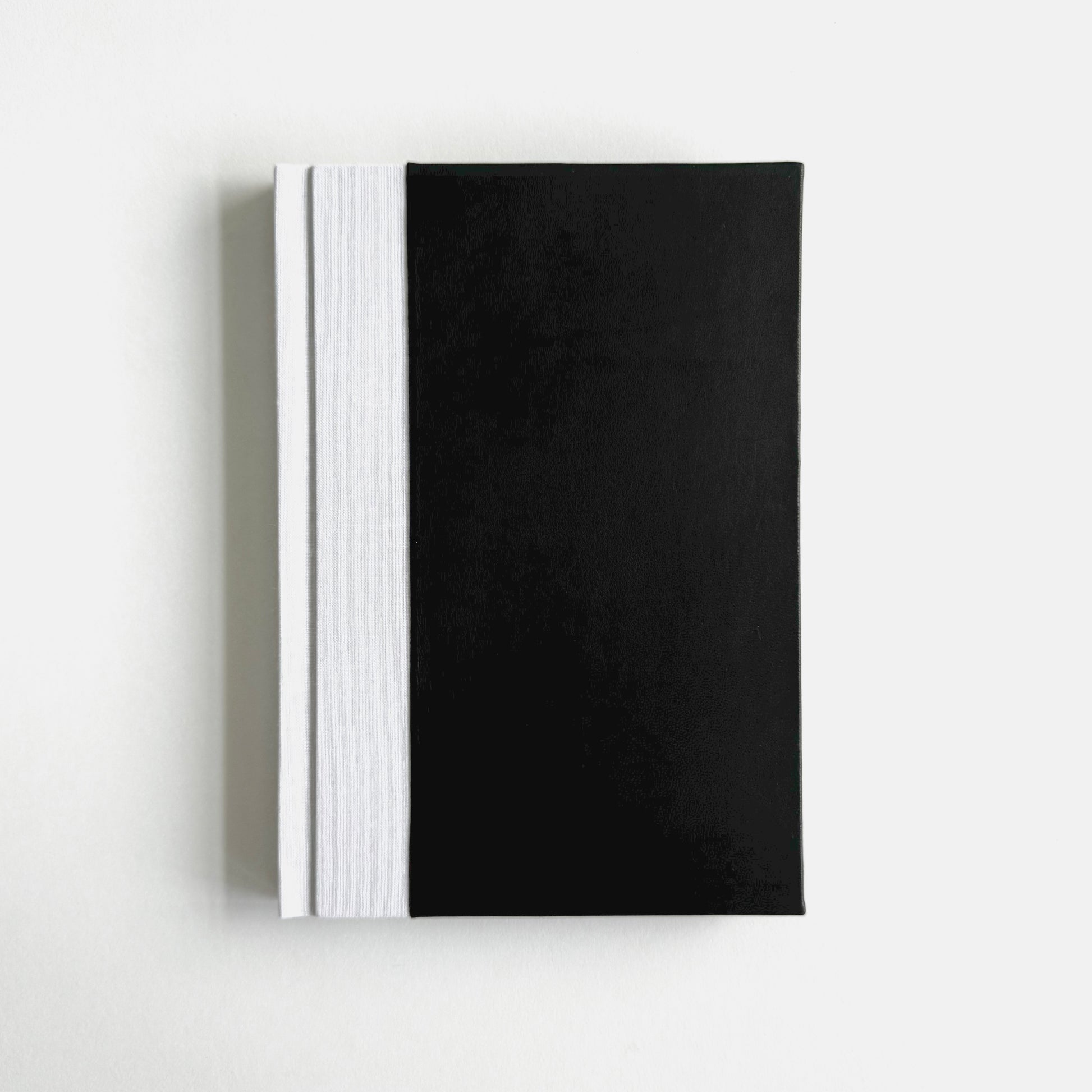 Siyah, mat, hakiki deri ve beyaz, keten cilt bezi ile ciltlendi.