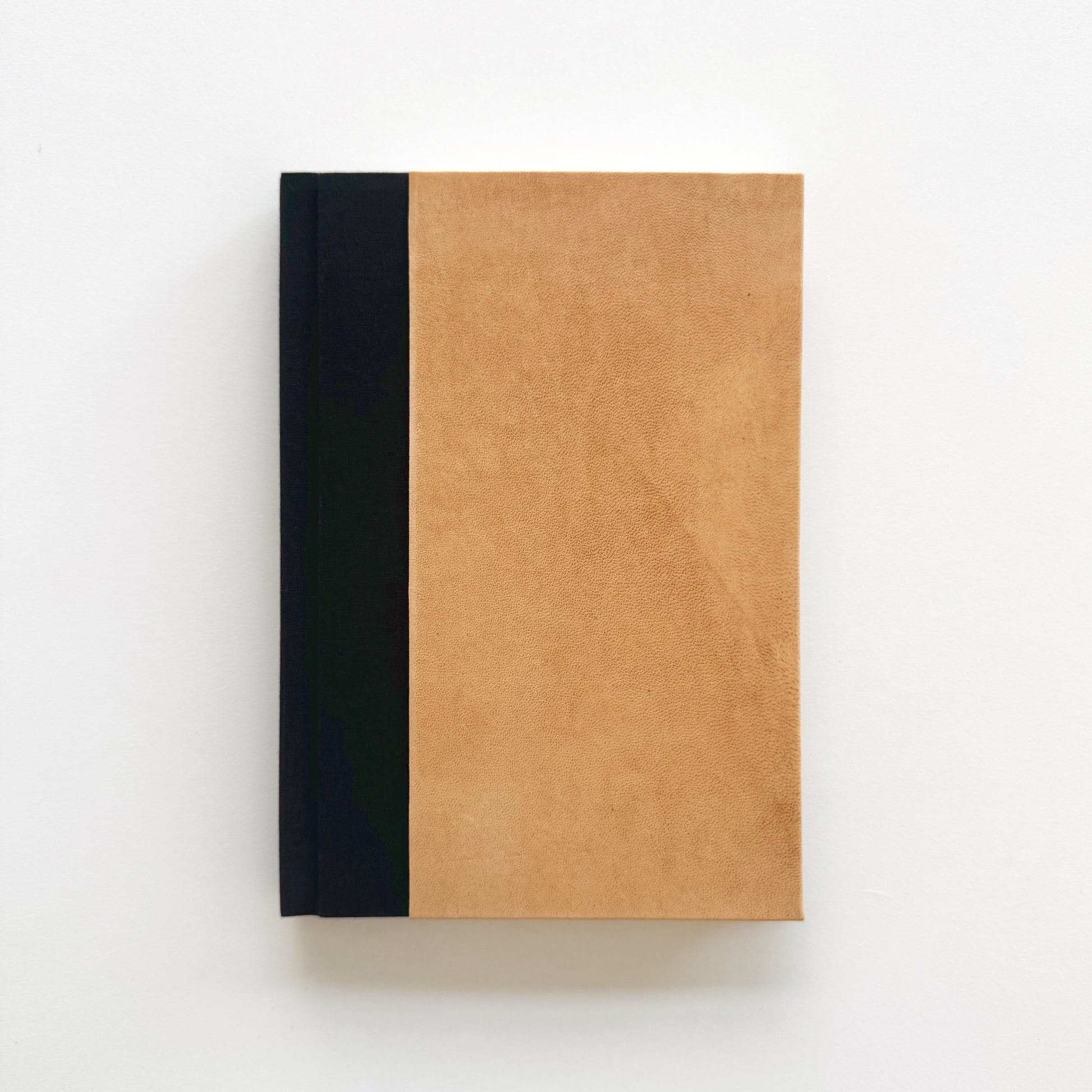 Sarı, mat, hakiki deri ve siyah, keten cilt bezi ile ciltlendi.