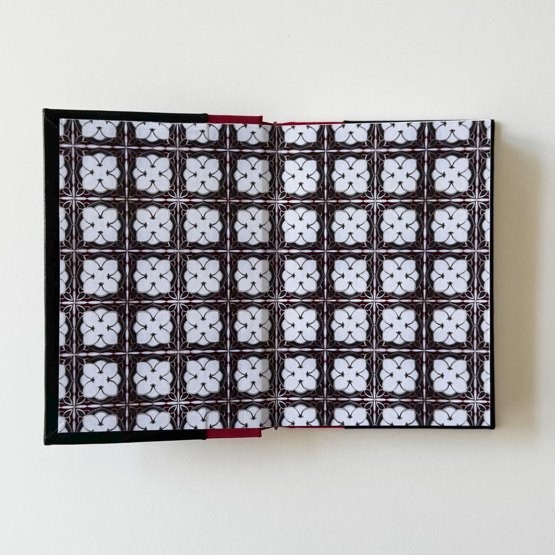 Siyah, parlak, hakiki deri ve kırmızı keten cilt bezi ile ciltlendi.
