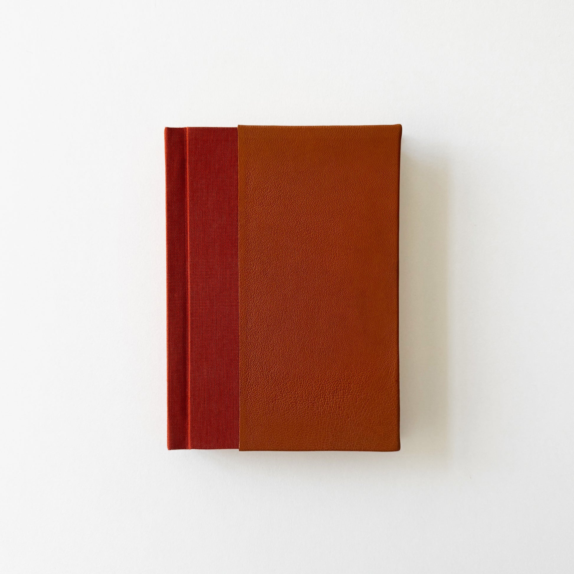Turuncu, mat, hakiki deri ve kiremit rengi keten cilt bezi ile ciltlendi.