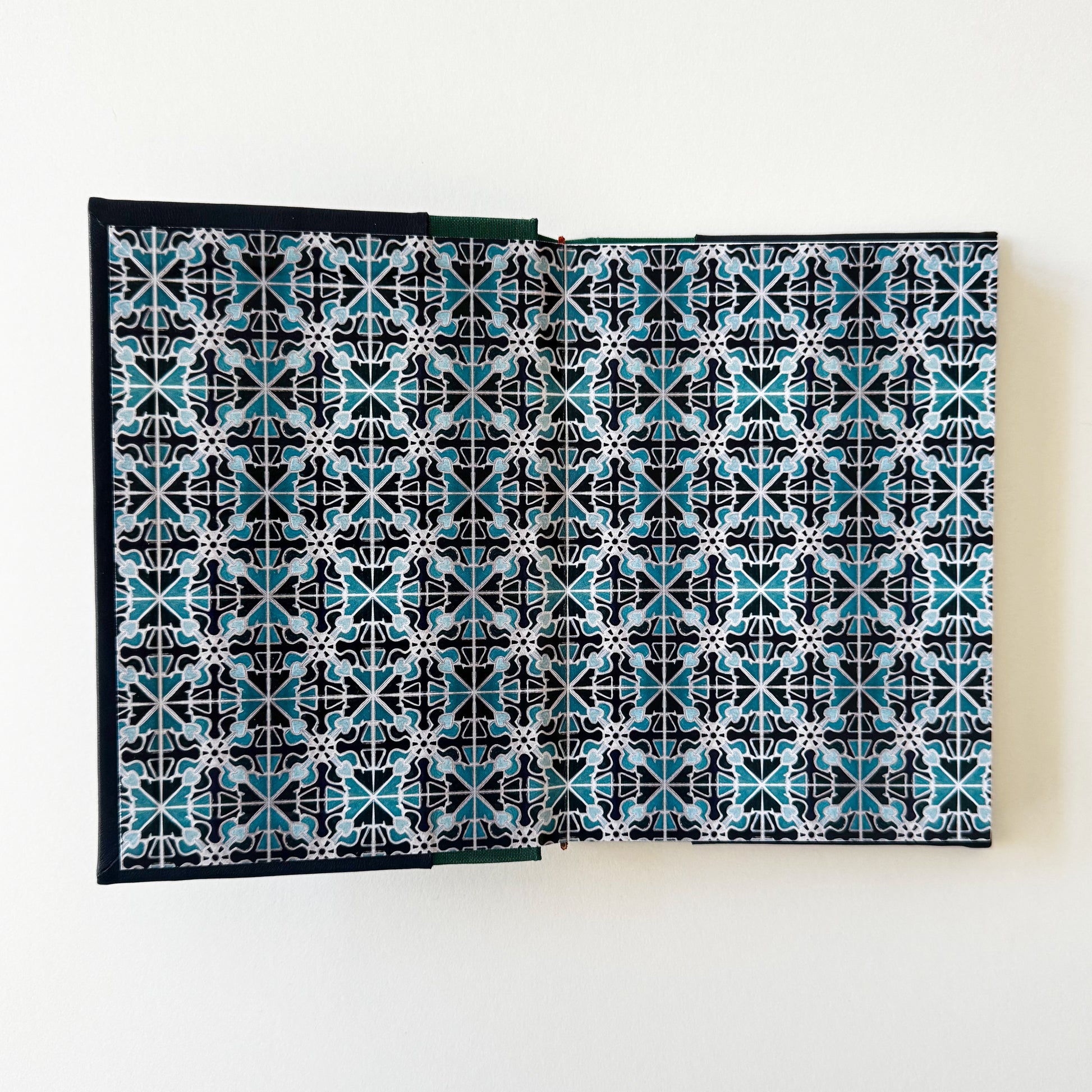 Lacivert, mat, hakiki deri ve yeşil keten cilt bezi ile ciltlendi.