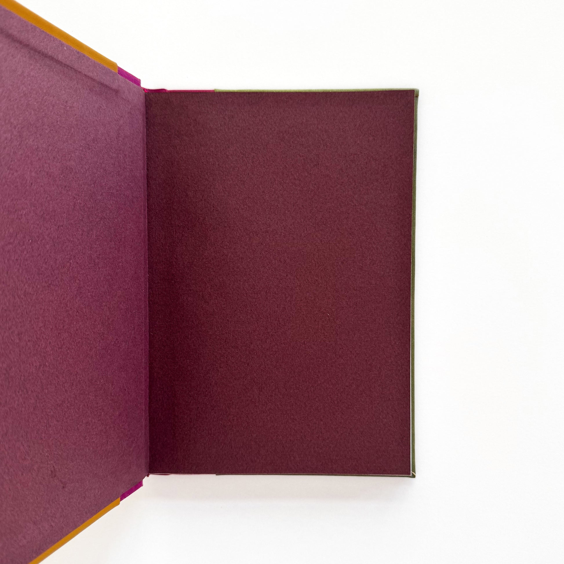 Ön kapağı sarı, mat, hakiki deri; arka kapağı yeşil, mat, hakiki deri ve sırtı fuşya, keten cilt bezi ile ciltlendi.