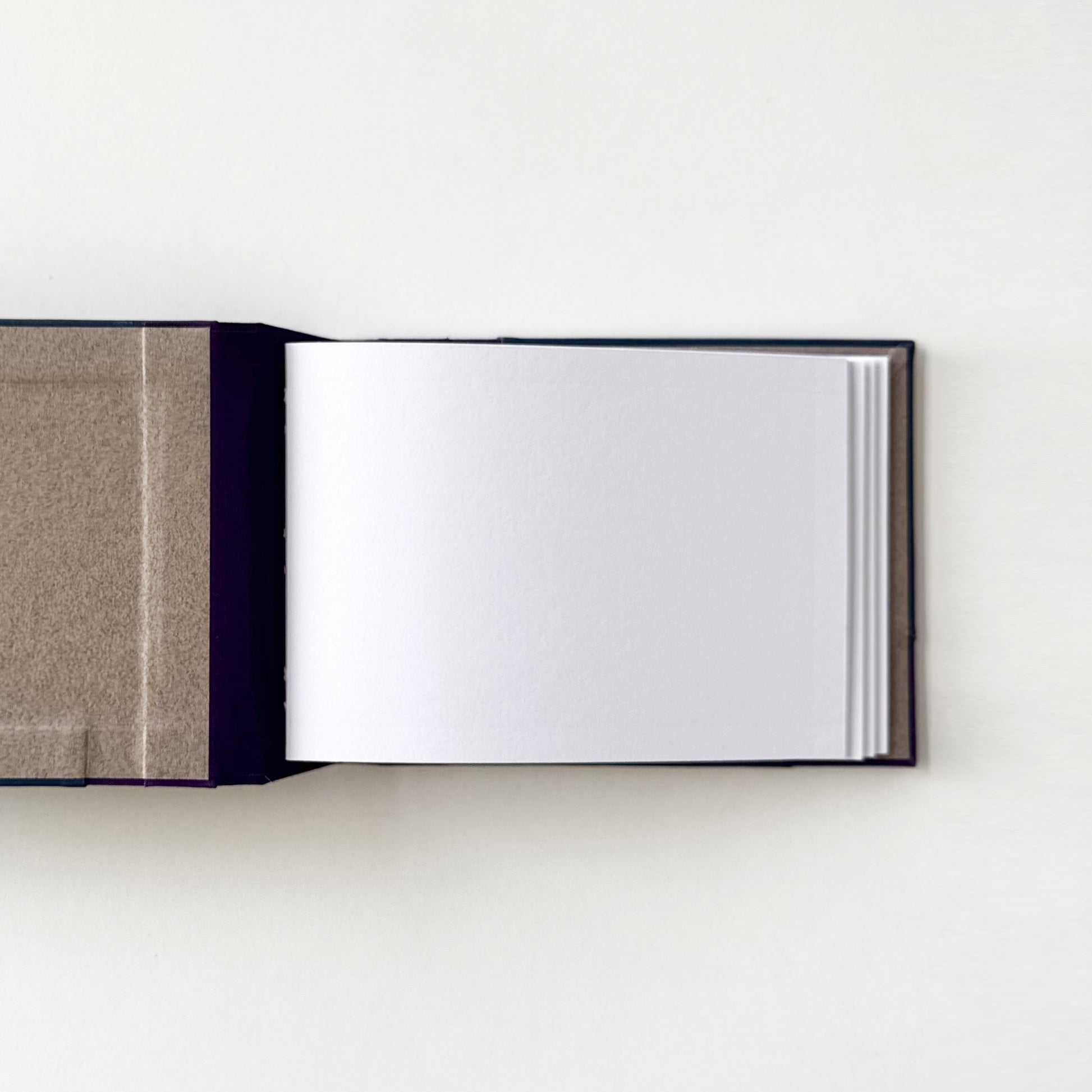 Boş iç sayfalara sahip bu albümde sayfalar, albüme eklenecek fotoğraflara gerekli alanı sağlamak adına, belirli aralıklarla ve direkt olarak sırta dikildi.