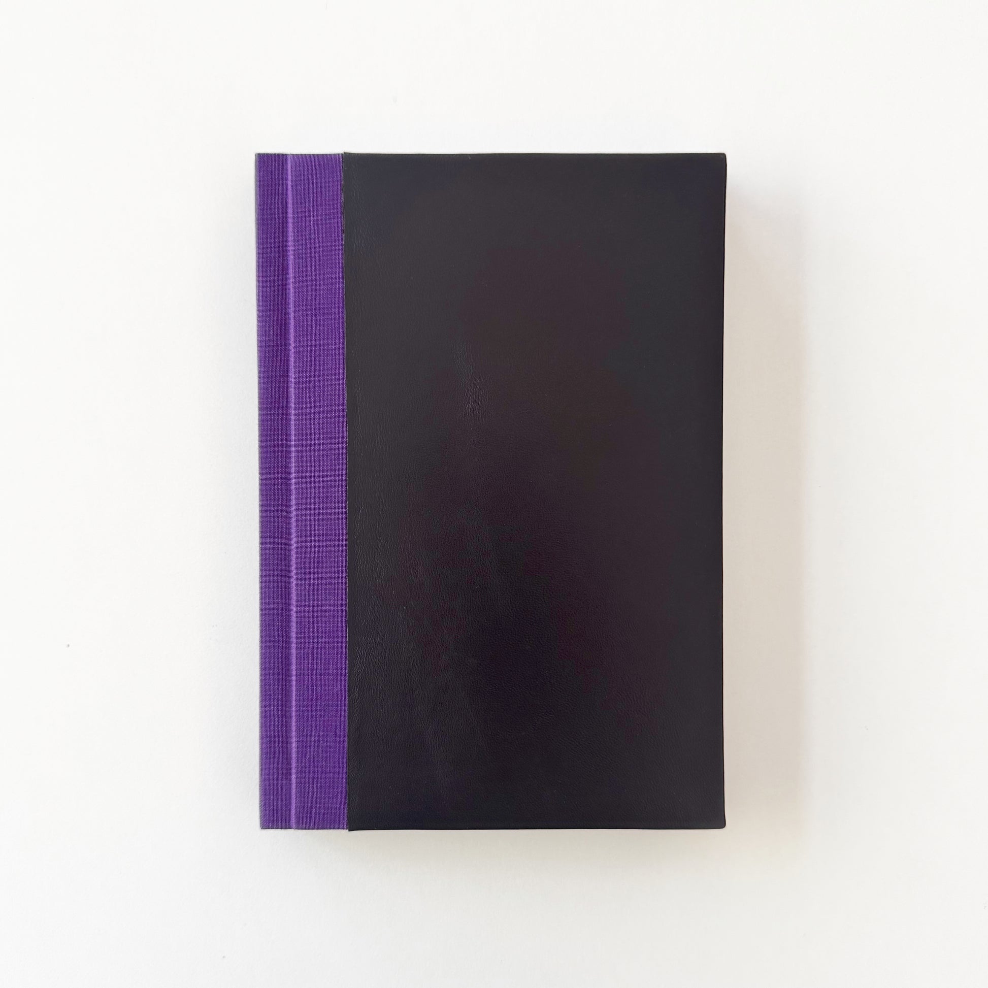 Koyu mor, parlak, hakiki deri ve mor, keten cilt bezi ile ciltlendi.